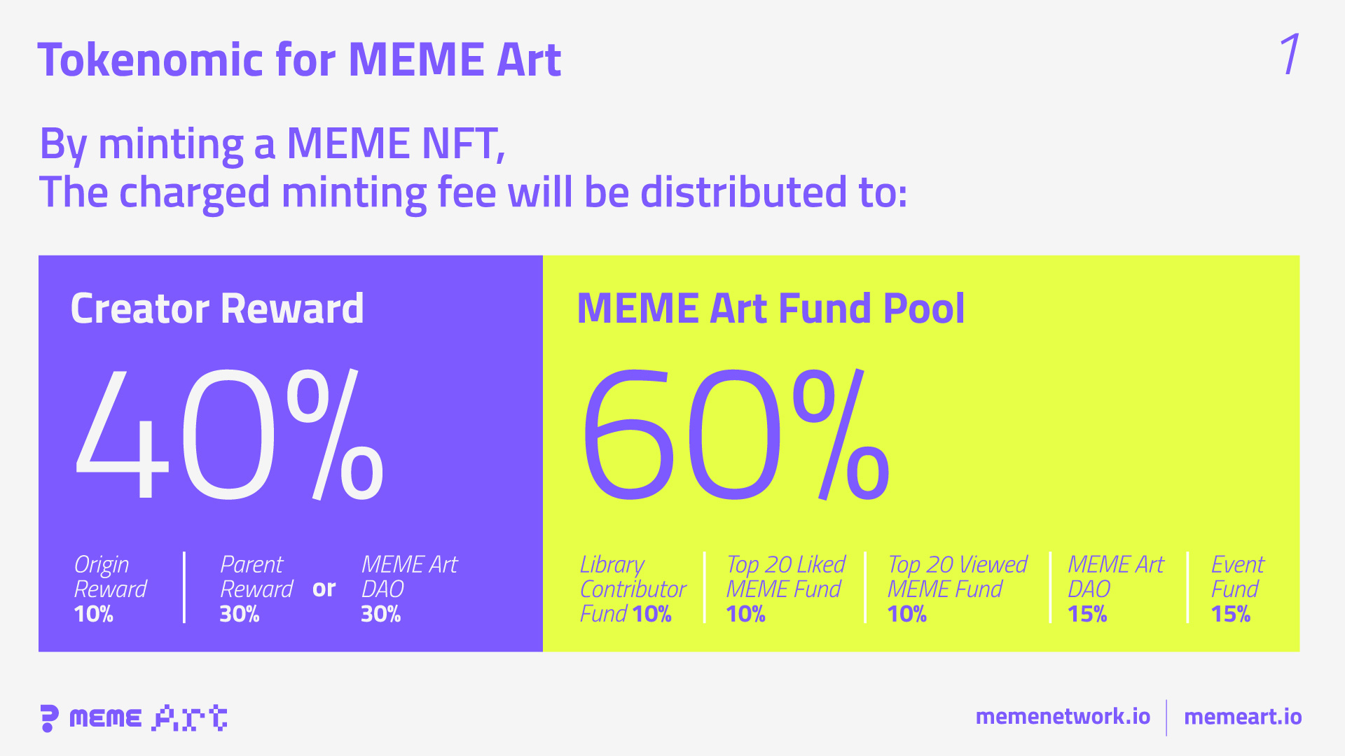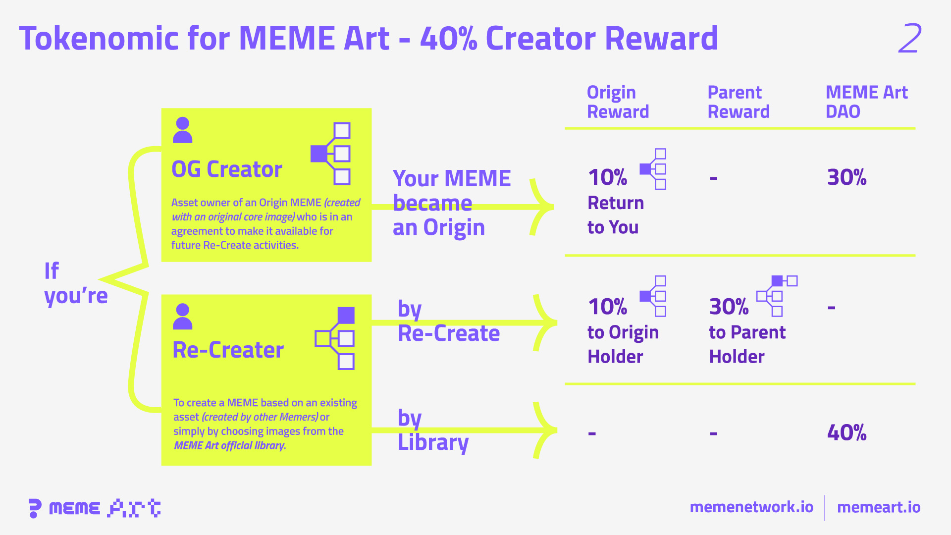40% of the creation fee will be distributed to the creators, broken down as: Parent Reward 30%: When a MEME is recreated by another person, the previous parent will receive 30% of the creation fee. Origin Reward 10%: If the creator is the original creator, they will receive 10% of the creation fee as a reward.