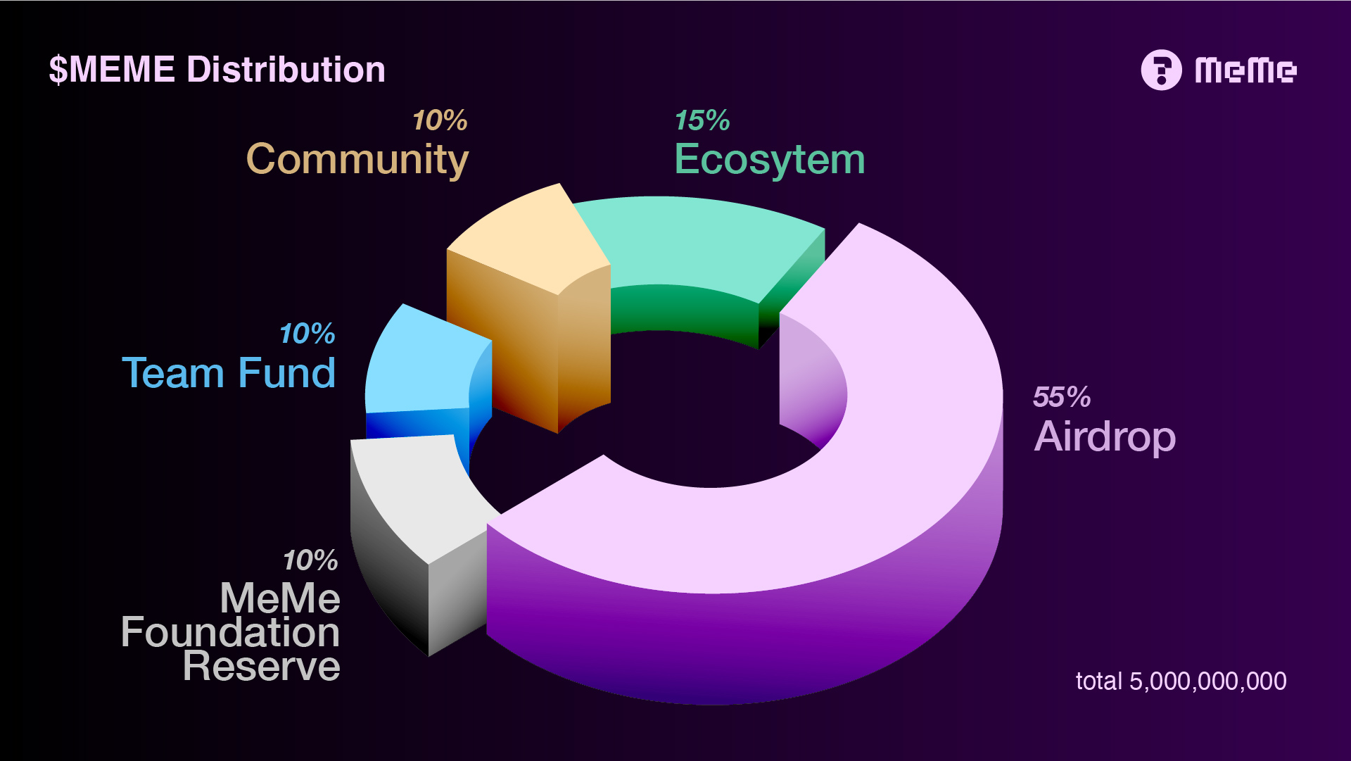 Meme Network starts with an initial supply of 5,000,000,000 MEME tokens. The 5 billion $MEME initial supply commemorates the milestone of the milestone global digital population and the internet users reaching 5 billion while Meme Network is on-chain in April 2022.